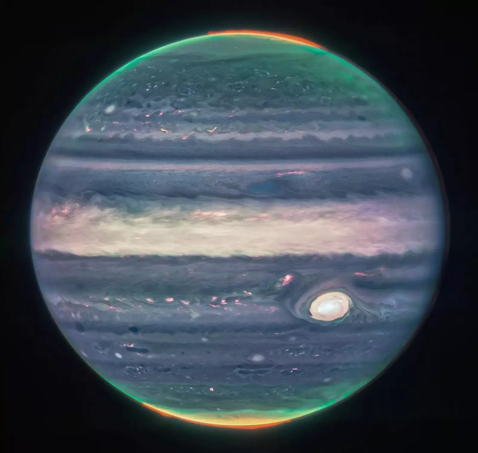 Фото снято камерой ближнего инфракрасного диапазона (NIRCam) телескопа, которая имеет три специализированных инфракрасных фильтра, показывающих детали планеты-гиганта.